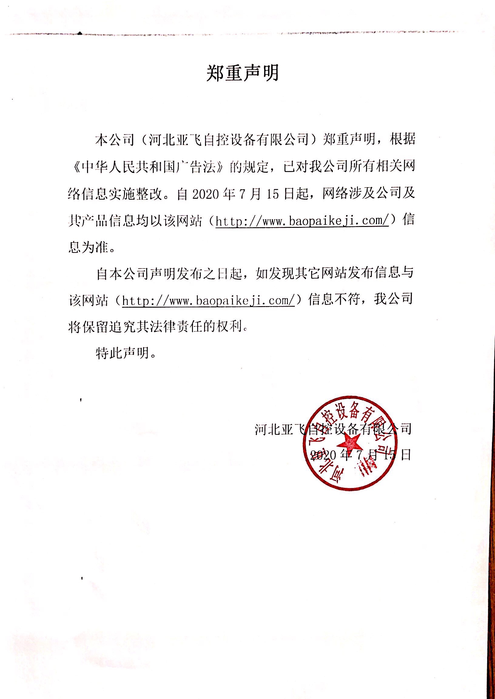 河北亞飛自控設(shè)備有限公司對相關(guān)網(wǎng)絡(luò)信息實施整改的鄭重聲明